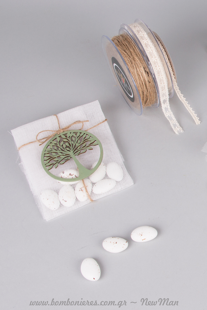 Για τη δημιουργία της θα χρειαστείτε: Δέντρο της Ζωής (διακοσμητικό), υφασμάτινη γάζα (33 x 33cm), Chalk paint (Vert bamboo) για να χρωματίσετε τα ξύλινα υπέροχα δεντράκια, κορδόνι γιούτα ψιλό σε φυσική απόχρωση και κουφέτα Χατζηγιαννάκης.