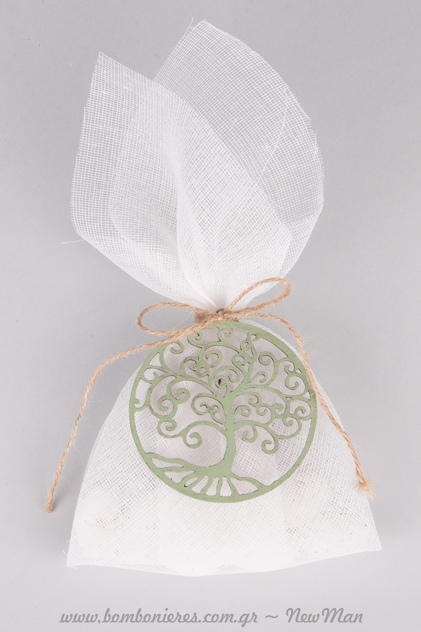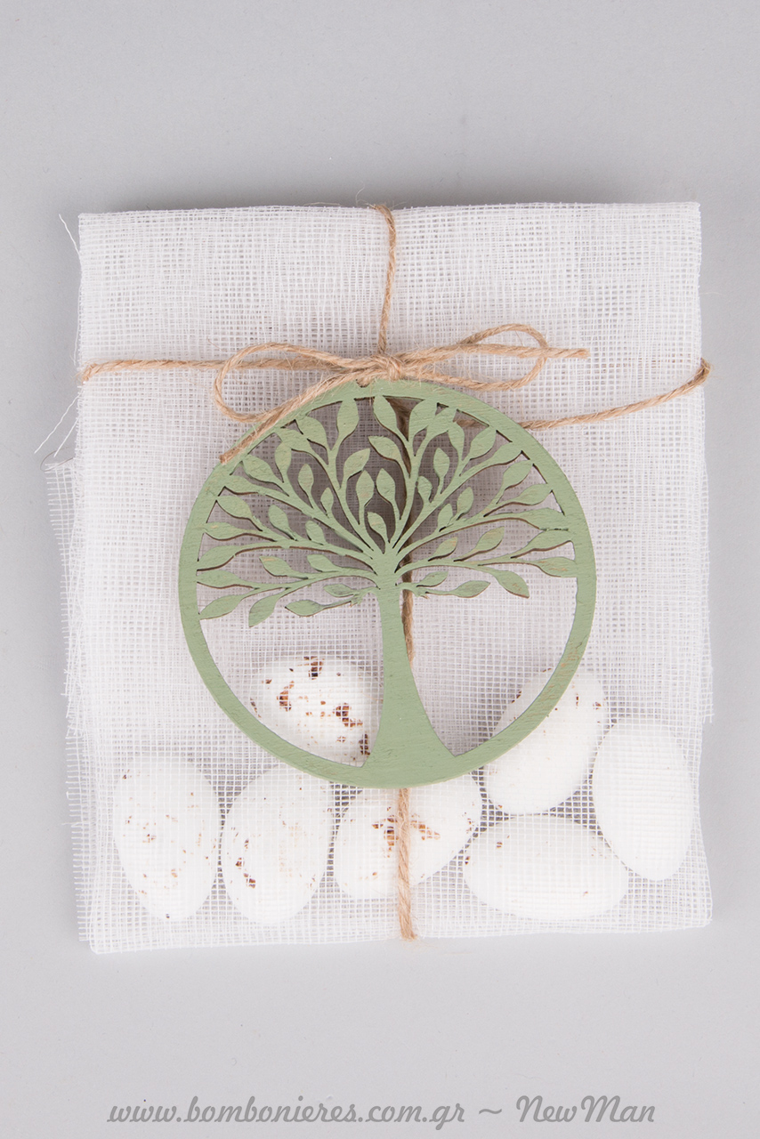 Εco- friendly μπομπονιέρα με Δέντρο της Ζωής σε φάκελο από υφασμάτινη γάζα.