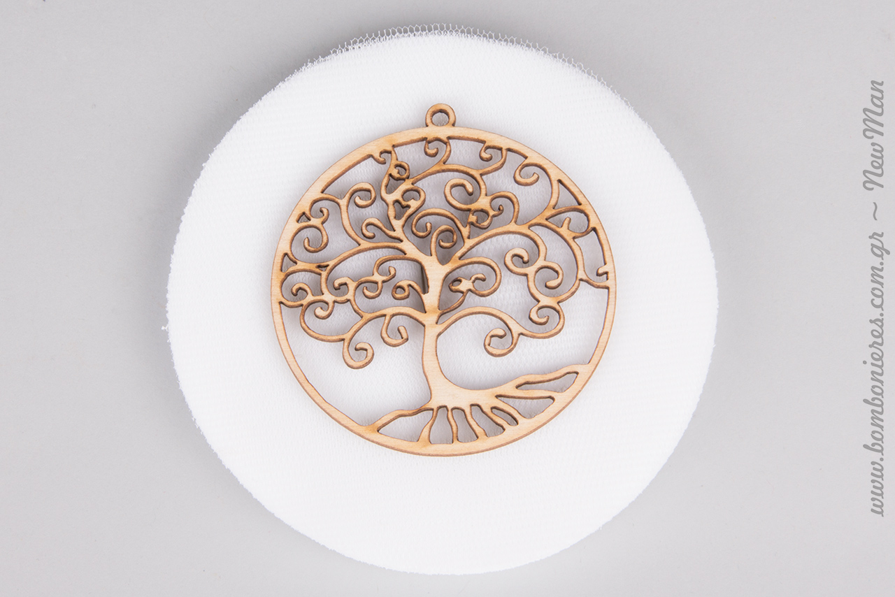 Διακοσμητικό ξύλινο Δέντρο της Ζωής σε φυσική απόχρωση (8cm). Διατίθεται σε συσκευασία των 6 τεμαχίων. Ξύλινο Δέντρο της Ζωής με Λευκό Ελληνικό Τούλι.