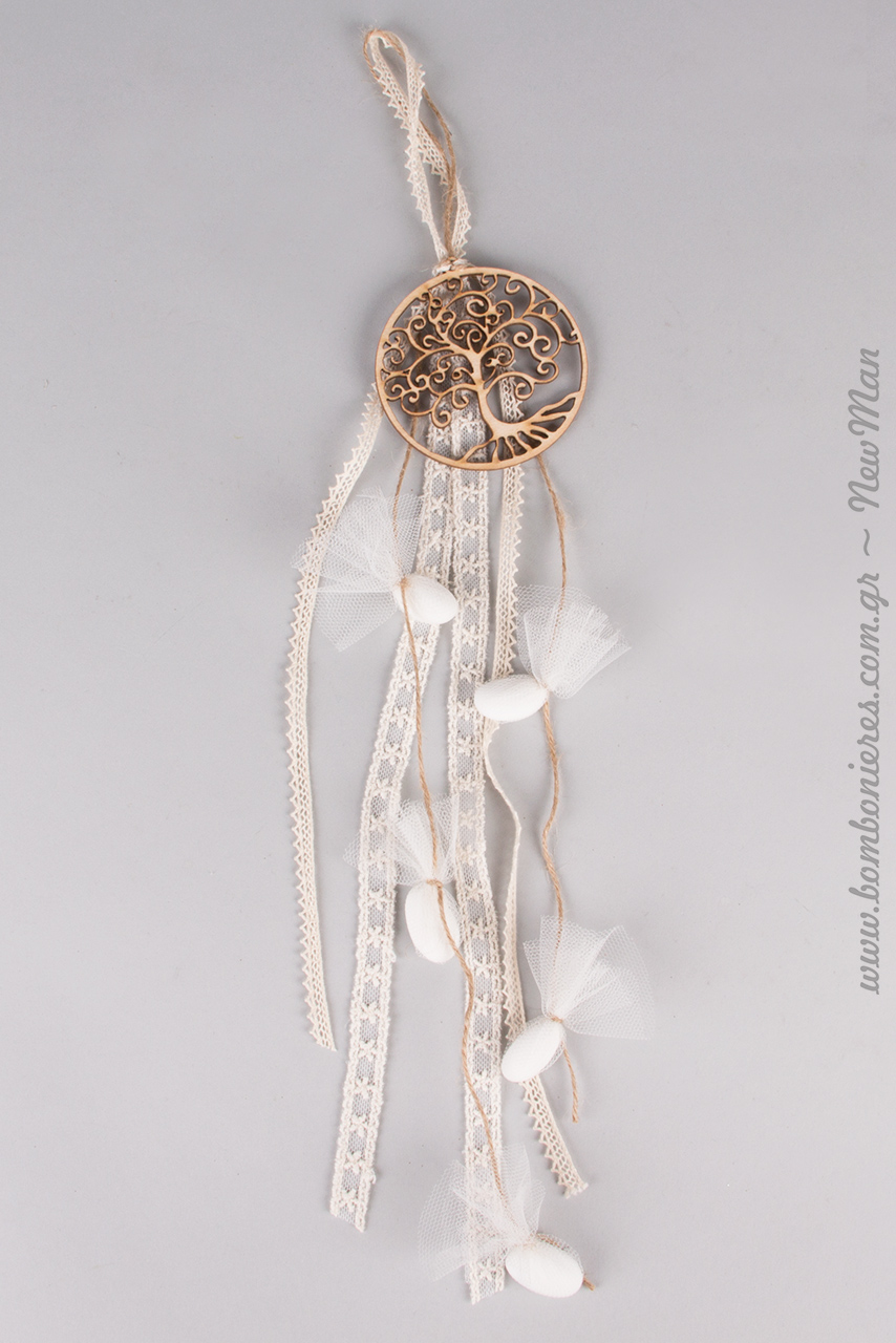 Κρεμαστή μπομπονιέρα, τύπου ονειροπαγίδα, με ξύλινο Δέντρο της Ζωής, δαντελοκορδέλες, κορδόνι γιούτα ψιλό και φυτίλι κέντημα σε τούλι.