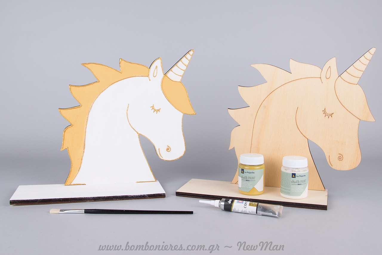 Τι σχέση έχει ένας ξύλινος Μονόκερως (26cm), τα χρώματα κιμωλίας (chalk paint) και τα πινέλα λαδιού; Μα φυσικά είναι μια καλή αφορμή για δημιουργία, για γνωριμία με διάφορες εύκολες τεχνικές χειροτεχνίας, για έμπνευση και φυσικά για μια υπέροχη διακόσμηση της θεματικής βάπτισης, του παιδικού πάρτι ή του παιδικού δωματίου.